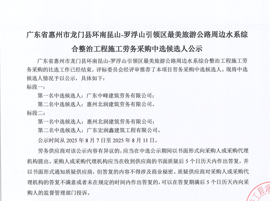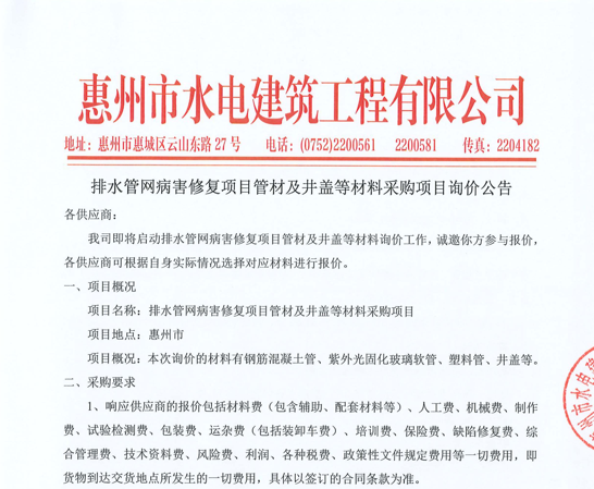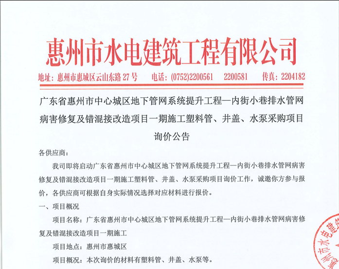 廣東省惠州市中心城區(qū)地下管網(wǎng)系統(tǒng)提升工程-內(nèi)街小巷排水管網(wǎng)病害修復(fù)及錯混接改造項(xiàng)目一期施工勞務(wù)采購比選公告……